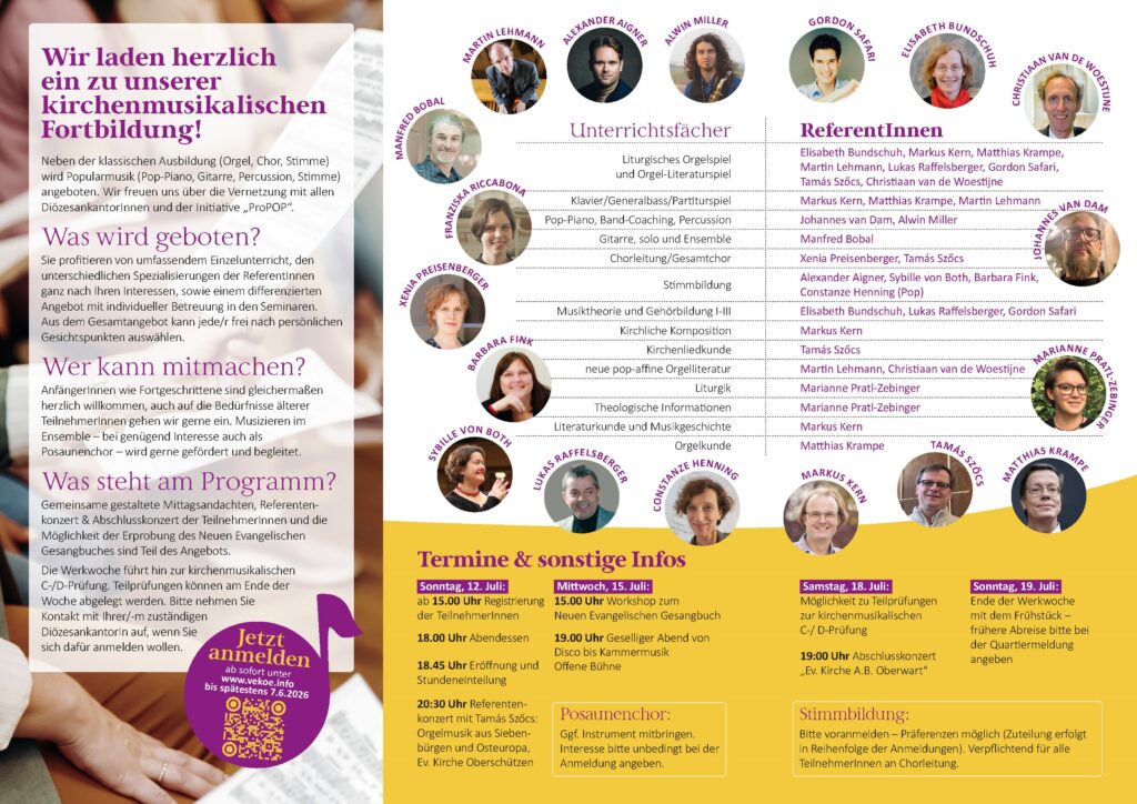 Die Werkwoche für evangelische Kirchenmusik in Oberschützen (Burgenland) ist unser zentrales Fortbildungsangebot und bietet ein großes Unterrichtsangebot mit individuell wählbaren praktischen Fächern (Orgel, Gesang, Chorleitung, Orgelimprovisation, Klavier, Pop-Piano, Gitarre,…). Sie ermöglicht die Vorbereitung zur D- oder C-Prüfung (Klassisch oder Pop) auch durch das Angebot zahlreicher weiterer Fächer wie Musiktheorie, Orgelbaukunde, Kirchenliedkunde, Musikgeschichte, Theologische Information. Mittagsandachten, Konzerte, die abendlichen Chorproben und die Freude an der generationsübergreifenden musikbegeisterten Gemeinschaft runden das Programm ab.