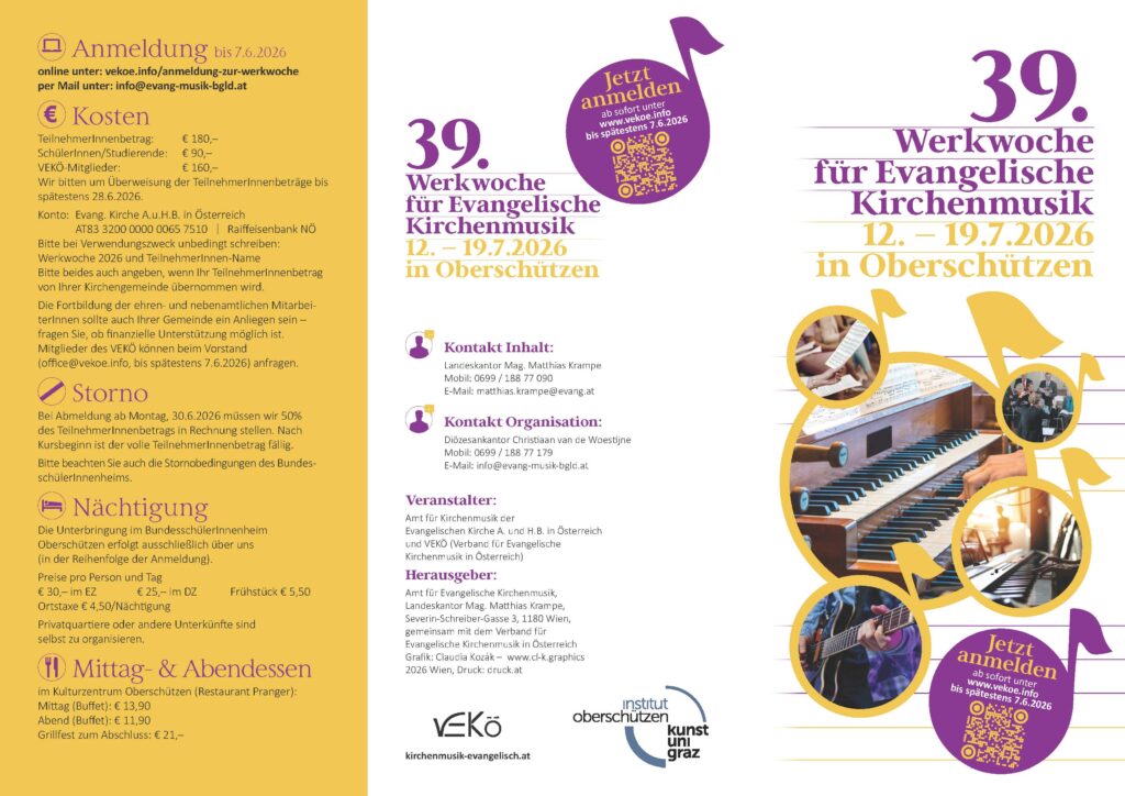 Die Werkwoche für evangelische Kirchenmusik in Oberschützen (Burgenland) ist unser zentrales Fortbildungsangebot und bietet ein großes Unterrichtsangebot mit individuell wählbaren praktischen Fächern (Orgel, Gesang, Chorleitung, Orgelimprovisation, Klavier, Pop-Piano, Gitarre,…). Sie ermöglicht die Vorbereitung zur D- oder C-Prüfung (Klassisch oder Pop) auch durch das Angebot zahlreicher weiterer Fächer wie Musiktheorie, Orgelbaukunde, Kirchenliedkunde, Musikgeschichte, Theologische Information. Mittagsandachten, Konzerte, die abendlichen Chorproben und die Freude an der generationsübergreifenden musikbegeisterten Gemeinschaft runden das Programm ab.